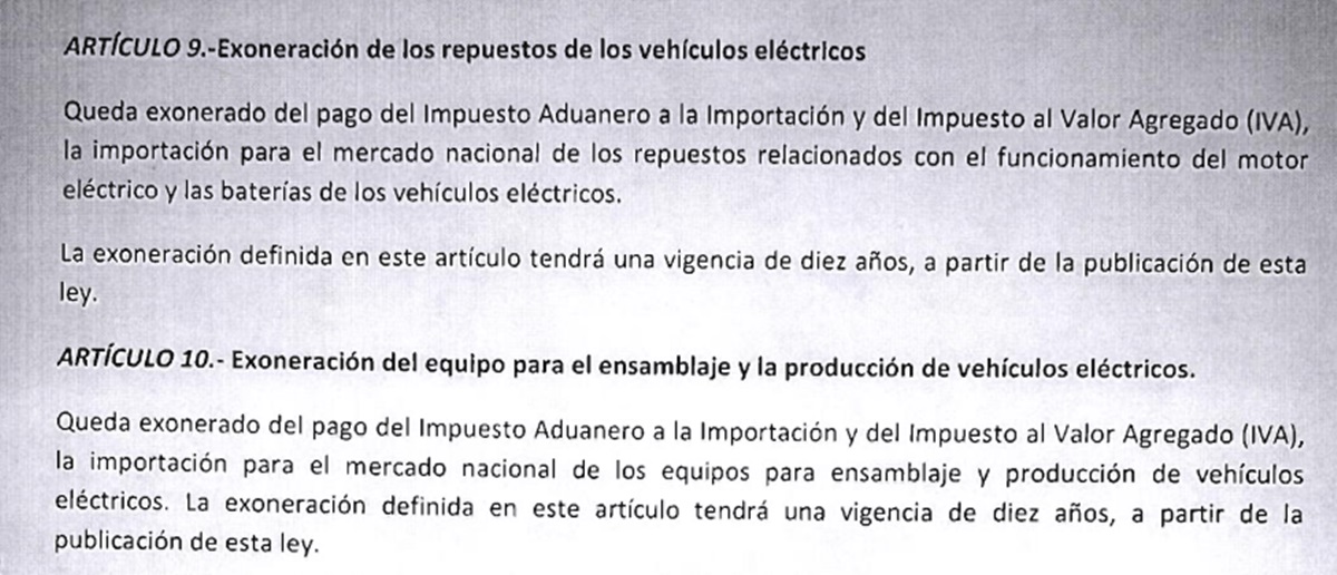 Uno de los puntos álgidos, pero de mucha expectativa para la región, es que establecer incentivos de caracter impositivo y económico como ser exoneración de impuestos aduaneros y del IVA a la importación de vehículos eléctricos, de sus repuestos y baterías, así como de todo equipo para ensamblaje y producción de vehículos eléctricos por diez años, a partir de la publicación de la ley.
